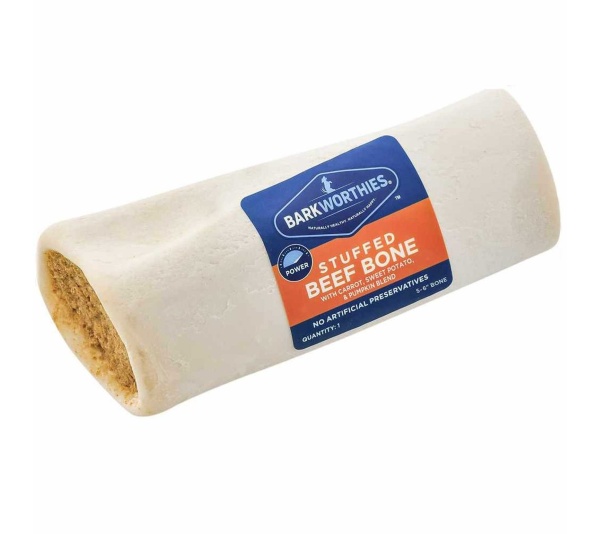 Barkworthies new 5-6" Stuffed Shin Bones are durable, long-lasting, and are now made with a variety of new and innovative fillings! These beef shin bones are made from free-range, pasture-raised cattle; and are paired with unique fillings such as superfood blends or natural peanut butter and meaty beef flavorings. Each stuffed shin bone provides dogs with a healthy chew alternative and can be refilled with their favorite snacks as an even longer-lasting chew! Recommended for medium sized dogs.